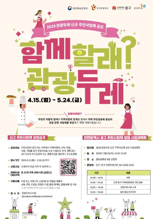 [뉴스서치] 인천시 중구는 한국관광공사 주관 ‘2024년 관광두레’에 참여할 신규 주민사업체를 모집한다고 1일 밝혔다.