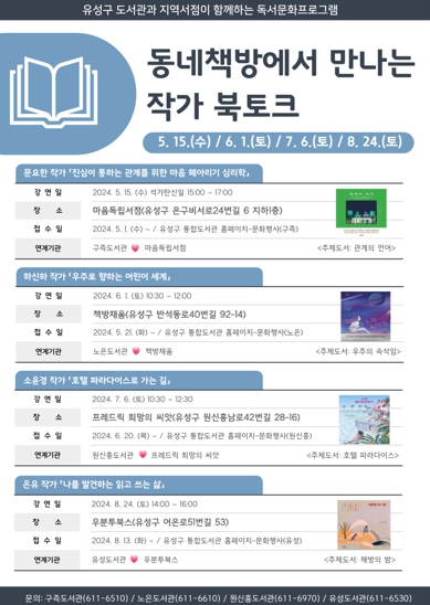 프로그램은 ▲5월15일 15시‘마음독립서점’문요한 작가 ▲6월1일 10시 30분‘책방채움’하신하 작가 ▲7월6일 10시 30분 ‘프레드릭 희망의 씨앗’소윤경 작가 ▲8월24일 14시‘우분투북스’은유 작가의 북토크로, 유성구에 거주하는 주민은 누구나 참여할 수 있으며, 신청방법 등 자세한 사항은 유성구 통합도서관 홈페이지를 통해 확인할 수 있다.