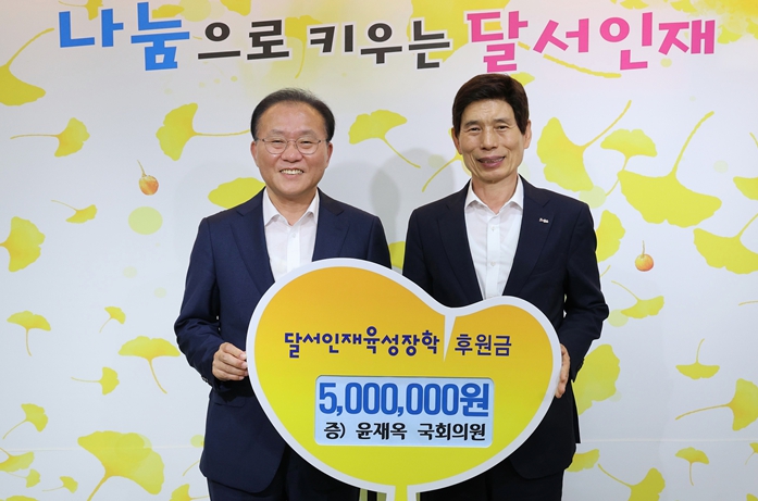 윤재옥 의원(국민의힘, 대구 달서을)은 지난 5월 28일 제4회 대한민국 국회 의정대상 ‘입법활동 부문 및 여야협치 부문’ 시상식에서 두 개 분야 우수의원으로 선정됐다. 이 기쁨을 지역 주민들과 함께하고자 수상금을 지역 장학재단인 (재)달서인재육성장학재단에 전달했다. 윤재옥 의원은 지금까지 1천만원을 달서인재육성대잔에 후원 했다.