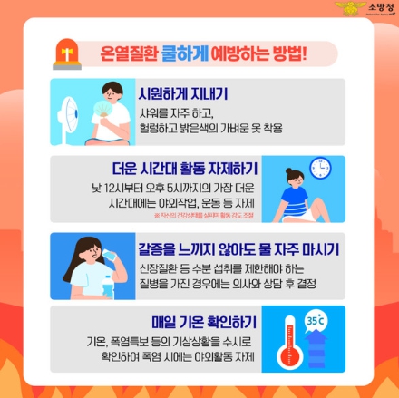 온열질환 예방수칙으로는 ▲충분한 수분 섭취 ▲한낮 야외활동 자제 ▲햇볕에 장시간 노출 피하기 등 안전수칙을 지켜줄 것을 당부했다.