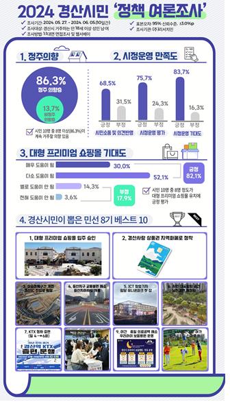 이번 여론조사에서는 △시민 정주의향 △시민소통 및 의견반영 △시정운영 평가 △시정운영 기대도 외에도 경산시민의 숙원이었던 △대형 프리미엄 쇼핑몰에 대한 시민 기대도와 △민선 8기 30가지 시책 중 베스트10을 선정하는 등 다양한 시민 행정수요 파악을 위해 새로운 시도를 했다.