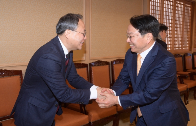 | ▲ 강기정 광주광역시장이 6일 시청 비즈니스룸에서 고기동 행정안전부 장관 직무대행과 악수를 하며 인사를 나누고 있다. |