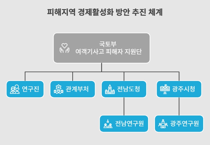 이에 따라, 국토교통부 12·29 여객기사고 피해자 지원단은 관계부처(문체부, 중기부 등 6개 부처), 광주‧전남 지자체 및 전문가와의 협의를 거쳐 전문적이고, 객관적인 피해 분석과 실질적 지원방안 마련을 위한 연구용역을 추진하게 됐다.