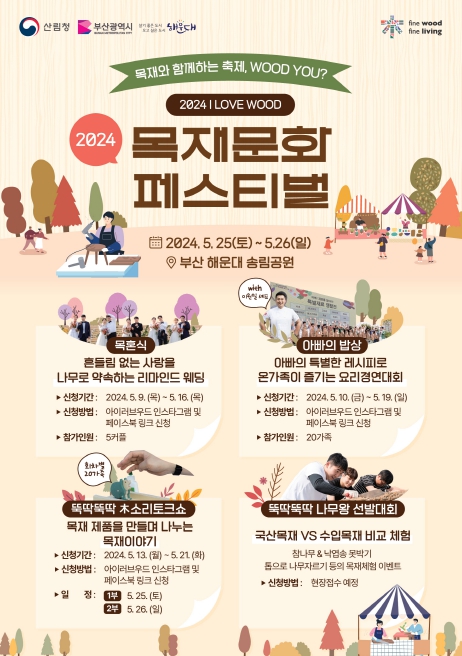 올해는 부산 해운대에서 개최되며 축제 첫째날인 25일에는 국산 목재를 직접 만지고 느껴보는 ‘뚝딱뚝딱 나무왕 선발대회’, 나무로 이어진 부부들의 사랑 이야기를 담은 ‘목(木)혼식’, 목재로 장난감을 만드는 ‘뚝딱뚝딱 목(木)소리 토크쇼 1부’가 열린다.