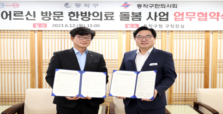 ▲ 지난해 6월, 박일하 동작구청장(우)이 동작구한의사회와「어르신 방문 한방의료 돌봄사업」업무협약 체결 후, 기념촬영을 하고 있다. |