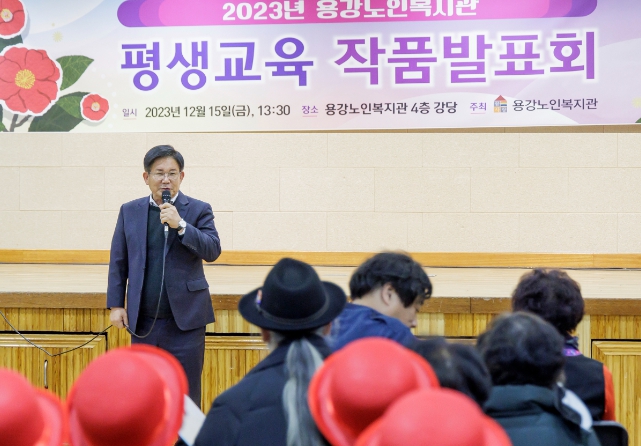 ▲ 지난해 용강노인복지관에서 열린 평생교육 작품발표회에 참석해 인사말을 전하는 박강수 마포구청장 |