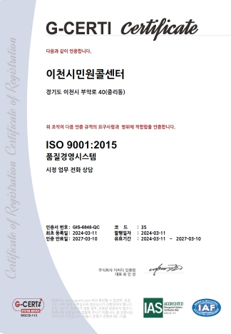 ▲ 이천시 민원콜센터, 국제품질인증 ISO 9001 인증 획득 |