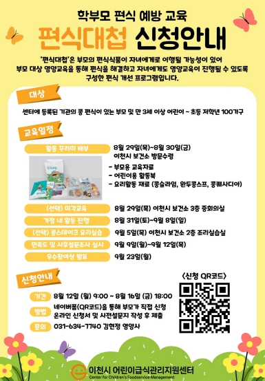 ‘편식대첩’은 센터에 등록된 기관의 ‘콩 편식’이 있는 학부모와 자녀(3~10세) 100가구를 대상으로 진행하며 프로그램 참여는 오는 8월 12일부터 16일까지 5일간 네이버 폼을 통해 개별로 신청받을 예정이다.