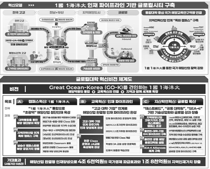 초광역모델인 국립한국해양대-국립목포해양대 통합모델은 '그레이트 오션 코리아(Great Ocean-Korea, GO-K)를 견인하는 1국 1해양대'를 비전으로 ▲지역 전략산업과 연계해 캠퍼스 특성화 및 해양 첨단분야를 확장하고 ▲현장형 해양산업 인재 육성 등 해양산업계 역량을 결집한다.