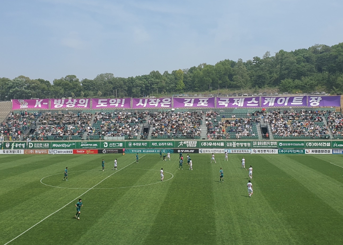 ▲ 김포FC 홈구장인 솔터축구장에서 개최된 2024시즌 홈개막전에 국제스케이트장 김포 유치를 향한 김포시민의 염원을 담은 대형현수막이 게시되어 있다. |