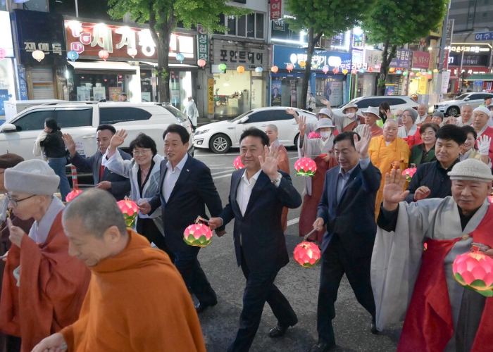 봉축 법요식이 끝난 후 진행된 제등행렬에는 7군단 군악대를 선두로 불교계 인사와 불자, 시장 및 국회의원 당선자 등과 함께 많은 시민이 행렬에 참여했다.