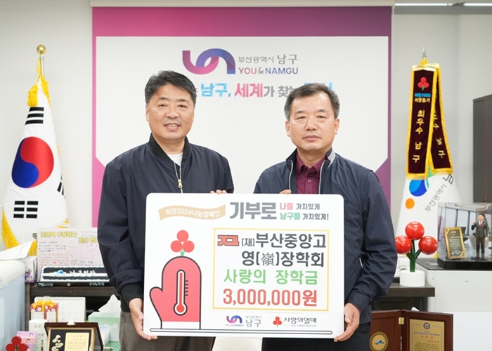 [뉴스서치] (재)부산중앙고등학교 영(嶺)장학회에서는 지난 22일 부산광역시 남구(구청장 오은택)에 저소득 청소년을 위한 장학금 300만원을 전달했다.