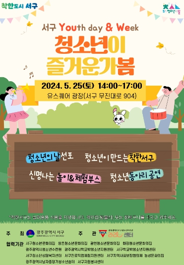 서구는 이날 부대행사로 청소년들이 마음껏 즐기고 소통할 수 있는 놀이와 체험, 먹거리, 버스킹 부스도 운영한다. 놀이존에서는 딱지치기와 전통놀이 체험, 학교 밖 청소년 정책에 대해 알아보는 OX퀴즈가 진행되고, 체험존에서는 바람개비, 에코백, 화분 만들기와 심리테스트 등이 진행된다. 또 버스킹존에서는 청소년 동아리들이 참여해 난타, 댄스, 태권도, 밴드 공연을 선보일 예정이다.