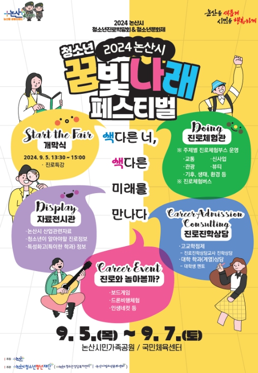 논산시는 5일부터 7일까지 청소년들이 진로와 미래에 대한 고민을 나누고, 마음껏 즐길 수 있는 시간을 만들어 주기 위한 ‘2024 논산시 청소년 꿈빛나래 페스티벌’을 개최한다.