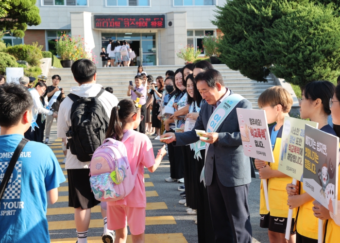 특히 송기섭 진천군수, 조성수 경찰서장, 서강석 교육장 등 기관장들이 함께해 ‘일단멈춤, 아이 먼저 보내주세요’라는 문구와 취지를 알렸으며 통학로 주변 안전도 살폈다.
