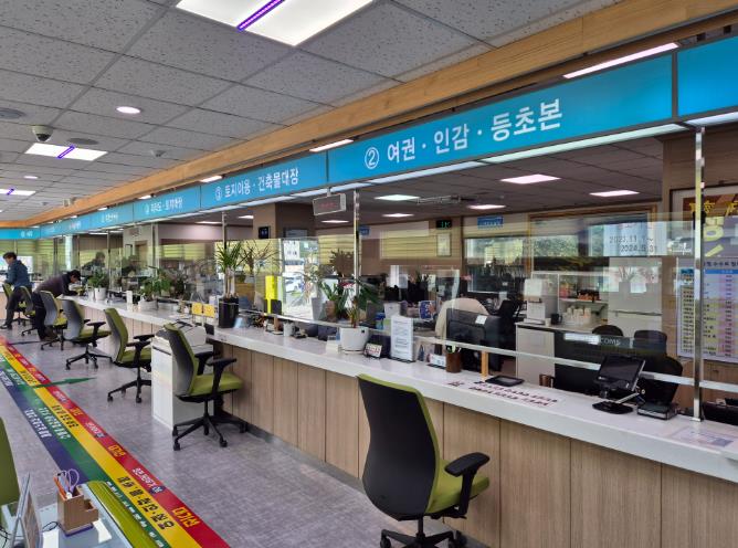 민원창구의 고정형 투명 안전유리는 코로나19로 유지됐던 안전 아크릴 가림막을 대체해 전염병을 예방한다.