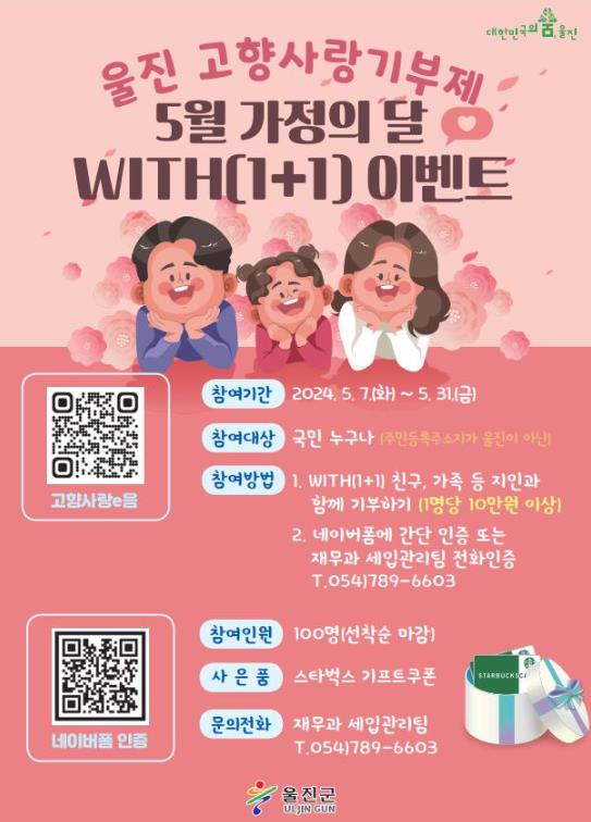 [뉴스서치] 울진군은 가정의 달을 맞아 고향사랑기부제의 활성화 및 기부금 모금 확대를 위해 5월 31일까지 ‘WITH(1+1)’이벤트를 실시한다.