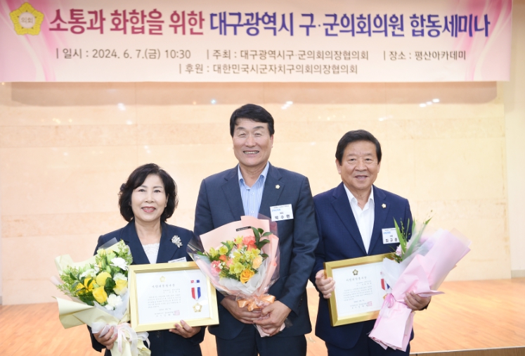 박수현 의장은 주민의 복리증진과 지역사회 발전에 선도적인 역할을 함으로써 지방의회의 위상을 제고하고, 지방자치 발전에 기여한 공로를 인정받아 ‘2024년 전국시군자치구의회의장협의회 지방의정봉사상’ 수장자로 선정됐다. 또한, 최규종, 김영숙 의원은 초선의원으로서 신뢰받는 의회 만들기에 앞장서 왔으며, 남다른 열정과 평소 발로 뛰는 현장 중심 의정활동으로 군민복지 증진과 군정발전에 헌신한 공로를 인정받아 ‘대구구군의장협의회 의정봉사상’ 수장자로 선정됐다.