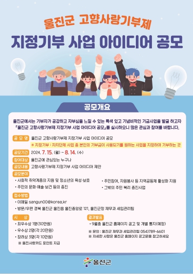 이번 아이디어 공모는 울진군에 관심 있는 누구나 참여 가능하고 이메일, 방문, 우편 접수의 방법으로 참여할 수 있으며, 공모분야는 △사회적 취약계층의 지원 및 청소년의 육성·보호 △주민의 문화·예술·보건 등의 증진 △주민참여, 자원봉사 등 지역공동체 활성화 지원 △그밖에 주민의 복리 증진에 필요한 사업의 추진 관련 지정기부 사업 아이디어를 제안 받는다.