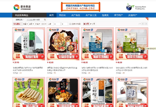 ▲ 중국 온라인 티몰 경상남도 수산식품 전용관 |