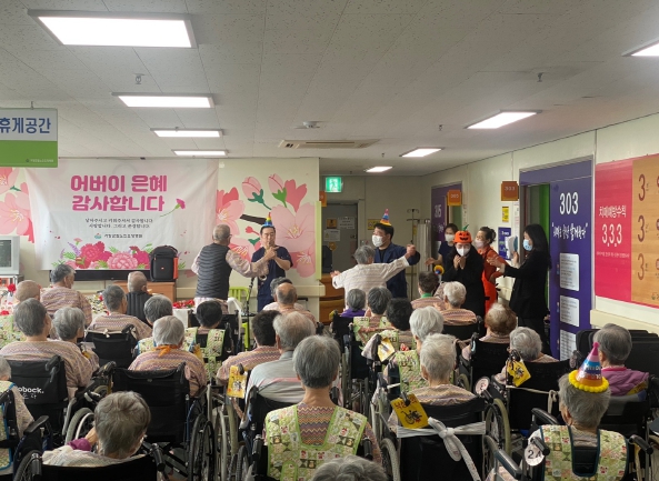 또한 직원들의 단체 어버이 은혜 합창과 병동에 근무 중인 정동명 간호사의 재능기부로 대나무 팬플룻, 하모니카를 활용한 흥겨운 축하 공연 등을 준비해 다채롭게 진행했고, 행사 참여가 어려운 와상 어르신은 김안택 원장님이 한 분 한 분 찾아뵙고 다과와 함께 어버이 은혜에 감사하는 마음을 전했다.