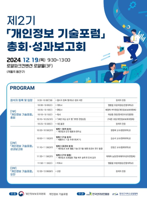 [뉴스서치] 개인정보 기술개발 활성화 및 산업 생태계 기반 구축을 위한 제2기 '개인정보 기술포럼'총회·성과보고회가 12월 19일 로얄파크컨벤션에서 열렸다. 이 자리에는 최장혁 개인정보보호위원회 부위원장을 비롯해 이상중 한국인터넷진흥원장(KISA) 등 관계기관 주요 인사가 참석했다.