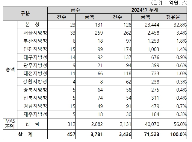 지역별 발주량을 보면, 총액계약 대상 899억 원 중 본청이 131억 원으로 14.6%를 집행하고 서울청 등 11개 지방청에서 768억 원을 각각 집행할 예정이다.