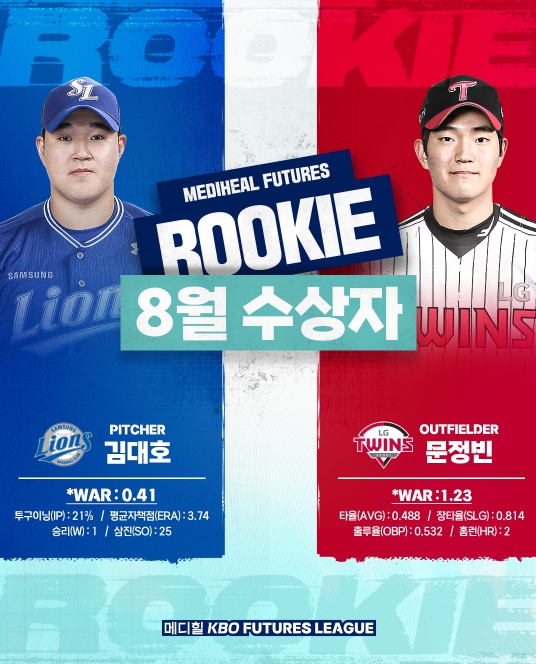 월간 메디힐 퓨처스 루키상은 입단 1~3년차 선수 중 퓨처스리그에서 규정이닝과 규정타석을 채운 선수를 대상으로 월간 WAR(대체 선수 대비 승리 기여도) 기준 최우수 투수와 타자를 선정하는 시상이다. 8월에 삼성 김대호는 WAR 0.41, LG 문정빈은 WAR 1.23을 기록했다.
