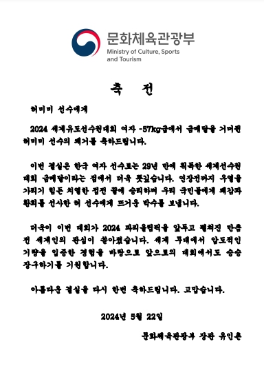 [뉴스서치] 문화체육관광부 유인촌 장관은 아랍에미리트 아부다비에서 열린 ‘2024 세계유도선수권대회(5. 19.~24.)’ 여자 -57kg급에서 금메달을 획득한 허미미 선수에게 축전을 보내 축하와 격려의 뜻을 전했다.