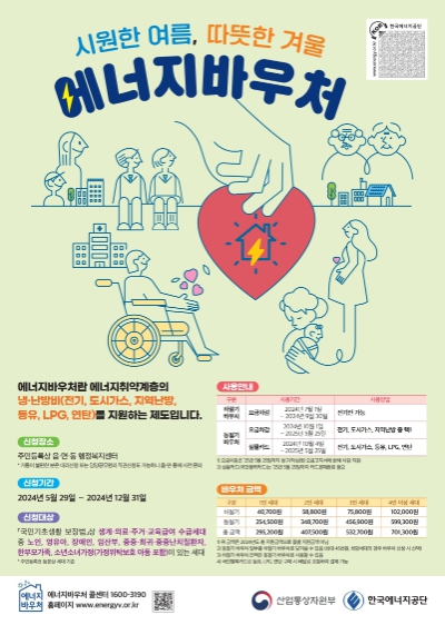 [뉴스서치] 취약계층을 대상으로 에너지비용을 지원해주는 에너지바우처의 ’24년도 사업이 본격 시작된다. 산업통상자원부는 5월 29일부터 12월 31일까지 전국 읍·면·동 행정복지센터와 복지로 홈페이지에서 올해 사업의 신청·접수를 진행한다고 밝혔다.
