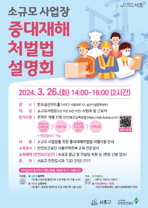 [뉴스서치] 서울 서초구가 26일 관내 5인이상 50인미만 소규모 사업장을 대상으로 반포심산아트홀에서 중대재해처벌법 설명회를 개최한다.