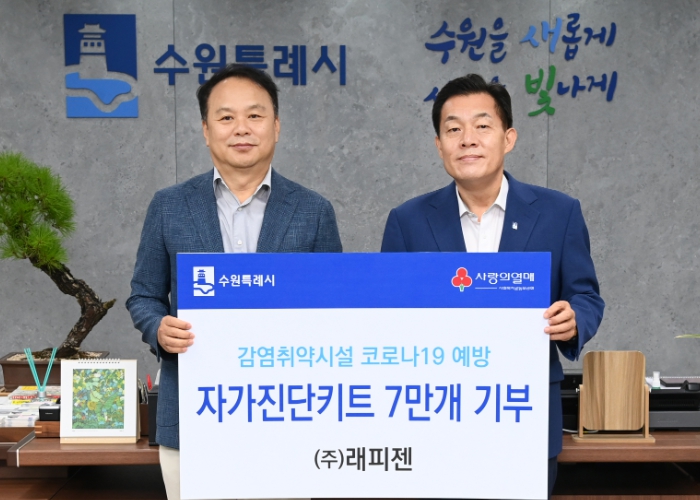 ㈜래피젠 박재구 대표와 표명수 이사는 22일 수원시청을 방문해 이재준 수원시장에게 자가진단키트를 전달했다.
