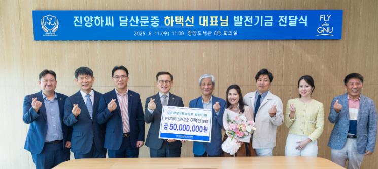 ▲ 경상국립대학교는 6월 11일 오전 중앙도서관 6층 회의실에서 ‘진양하씨 담산문중 발전기금 전달식’을 개최했다. |