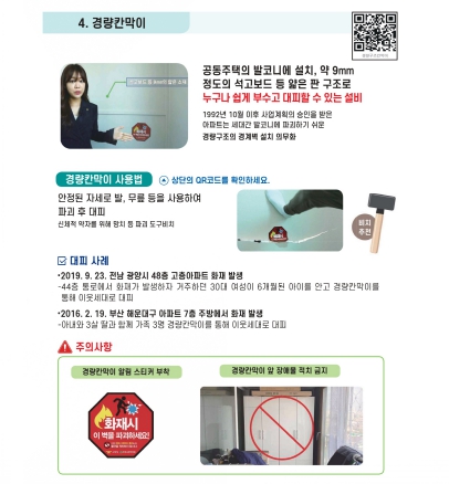 실제 2016년 2월 부산에서는 가족 3명이 경량칸막이를 통해 이웃 세대로 대피했고 2019년 9월 전남 광양에서는 44층 통로에서 화재가 발생하자 거주하던 30대 여성이 6개월 된 아이를 안고 경량칸막이를 통해 이웃 세대로 대피했다.