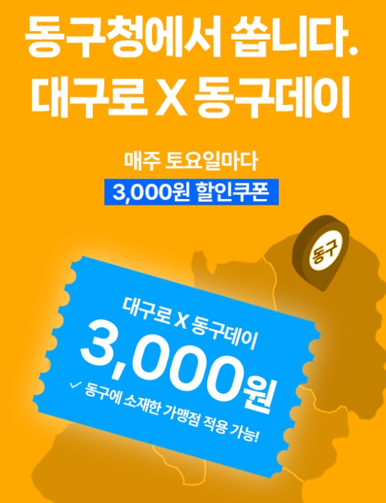 공공플랫폼 ‘대구로’에서 진행되며, 최소 배달 주문 금액을 충족하면 매주 토요일마다 1인당 3천원, 1매의 쿠폰을 동구 가맹점에서 사용이 가능하다.