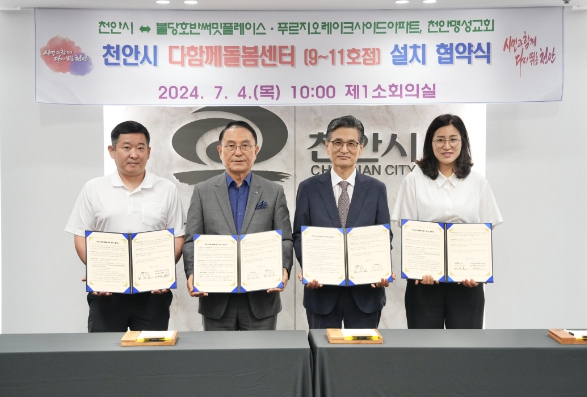 [뉴스서치] 천안시는 4일 불당호반써밋플레이스 ・ 천안푸르지오레이크사이드아파트, 천안명성교회와 다함께돌봄센터 9·10·11호점 설치·운영 위한 무상 임대 협약을 체결했다.