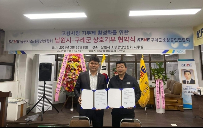 소상공인연합회 회원들은 지난달 25일 남원시 소상공인협의회 사무실에서 고향사랑기부금 상호 기부 협약식을 하고 서로의 지역에 300만 원을 기부했다.