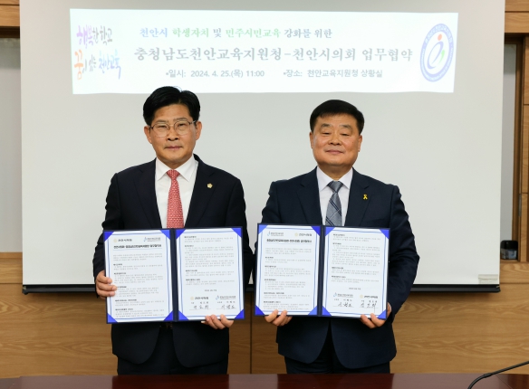 [뉴스서치] 천안시의회는 25일 천안교육지원청과 청소년 사업의 효율적 업무추진을 위하여 MOU를 체결했다. 그 간 천안시의회는 지역 내 청소년들의 민주 시민 의식 강화와 지방자치의 기능 및 역할에 대한 교육을 위하여 청소년 의회교실 및 청소년·어린이의회와 같은 교육 사업을 시행하여 왔다.