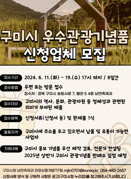 [뉴스서치] 구미시는 6월 11일부터 19일까지 지역 대표 관광기념품의 경쟁력을 강화하고 지역경제 활성화를 도모하기 위해‘구미시 우수관광기념품’신청 업체를 모집한다.