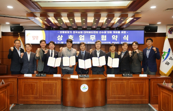 [뉴스서치] 밀양시는 지난 27일 시청 소회의실에서 한국 연맹회장기 전국실업·대학배드민턴 선수권대회의 성공적인 개최를 위한 협약을 체결했다고 밝혔다.