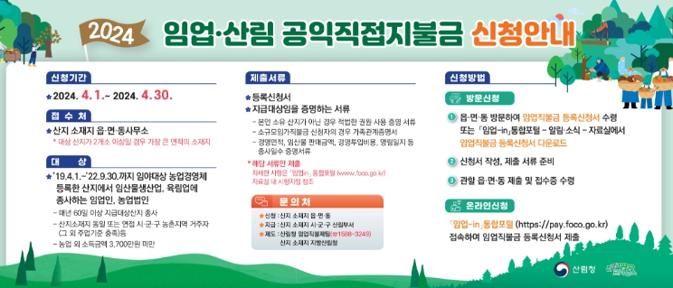 이달 30일까지 신청해야만 직불금 지급 대상이 될 수 있는 만큼 아직 신청하지 못한 지급 대상 임업인은 기한 내 신청을 완료할 수 있도록 서둘러야 한다.