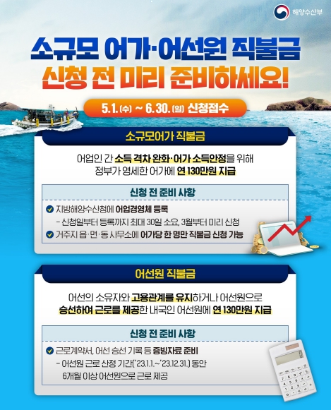 신청은 울진군청 해양수산과 및 남울진민원센터를 방문하여 하면 되고, 소규모어가와 어선원 직불금 대상으로 선정이 되면 각각 130만원이 지원된다.