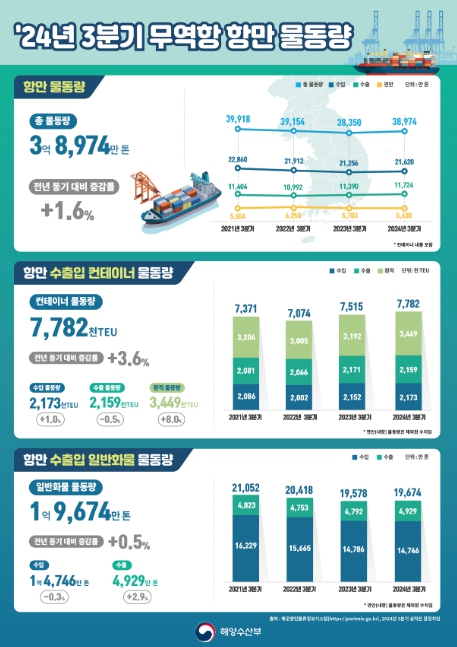 2024년 3분기 수출입 물동량은 전년 동기(3억 2,646만 톤) 대비 2.1% 증가한 3억 3,344만 톤으로 집계됐으며, 연안 물동량은 전년 동기(5,703만 톤) 대비 1.3% 감소한 5,630만 톤이었다.