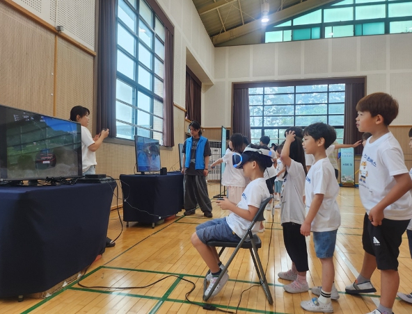 이날 행사는 교사와 전교생 약 70여명이 대한체육회에서 지급해준 단체티셔츠를 입고 드론 및 골프, 뉴스포츠 등을 체험해보고, 스포츠버스에 탑승해 영상매체를 통해서만 접해왔던 양궁, 펜싱 등의 운동기구를 직접 만져보고 착용해보는 시간을 가졌다.