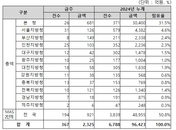 지역별 발주량을 보면, 총액계약 대상 1,404억 원 중 본청이 681억 원으로 48.5%를 집행하고 서울청 등 11개 지방청에서 723억 원을 각각 집행할 예정이다.