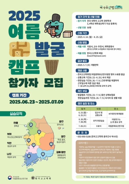 [뉴스서치] 국가유산청 국립문화유산연구원은 한국고고학회와 함께 6월 23일부터 7월 9일까지 약 3주간 대학생을 대상으로 한 발굴조사 현장실습 교육과정인 ‘여름 발굴캠프’를 개최하기로 하고, 4월 14일부터 25일까지 참가자 50명을 모집한다.