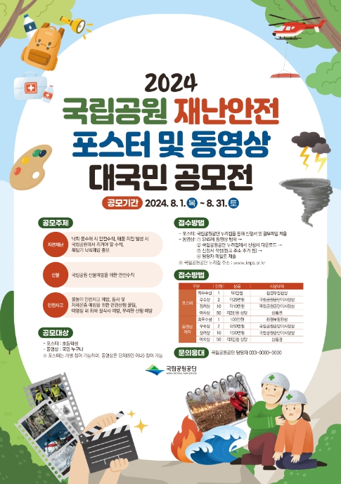 [뉴스서치] 환경부 산하 국립공원공단은 자연재난, 산불, 탐방객 안전사고 예방을 주제로 ‘2024년도 국립공원 재난안전 포스터 및 동영상 공모전’을 8월 1일부터 31일까지 개최한다고 밝혔다.