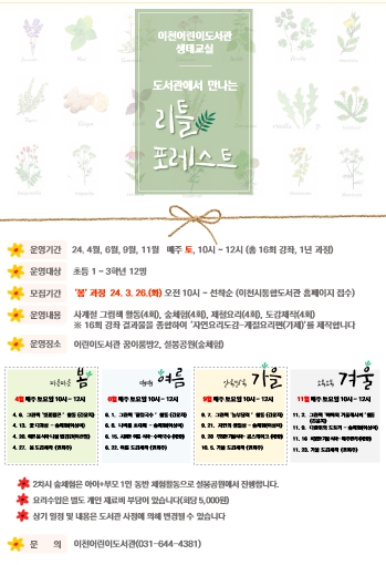 [뉴스서치] 이천시 어린이도서관은 4월 6일부터 그림책 기반의 생태교실 프로그램인 '도서관에서 만나는 리틀 포레스트'를 운영한다고 밝혔다.