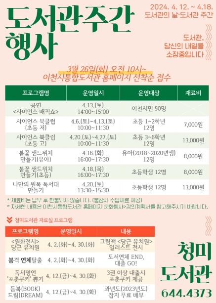 [뉴스서치] 이천시 청미도서관에서는‘제60회 도서관 주간(4. 12. ~ 4. 18.)’을 맞아 4월 한 달간 다양한 독서문화 행사를 펼친다.