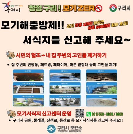 모기 유충이나 성충모기 서식처 발견 시 신속한 방역을 위해 구리시청 보건정책과 감염병관리팀 또는 구리시보건소 홈페이지 ‘모기서식지 민원신고 처리센터’로 신고하면 된다.